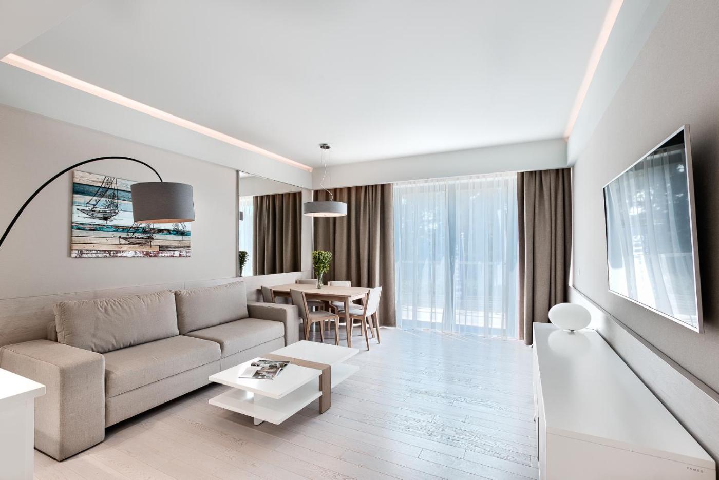 Apartament typu Deluxe z 1 sypialnią – 128B. Apartament mieści salon, oddzielną sypialnię oraz łazienkę z prysznicem i bezpłatnym zestawem kosmetyków. Goście mogą przygotowywać posiłki w aneksie kuchennym z płytą kuchenną, lodówką, zmywarką do naczyń i przyborami kuchennymi. Apartament jest klimatyzowany. Goście mają do dyspozycji jadalnię, część wypoczynkową z telewizorem z płaskim ekranem, pralkę, szafę oraz zestaw do parzenia kawy i herbaty. W opcji zakwaterowania znajdują się 2 łóżka. Apartament - 4 osobowy. Powierzchnia pokoju ok.: 50 mkw. ;