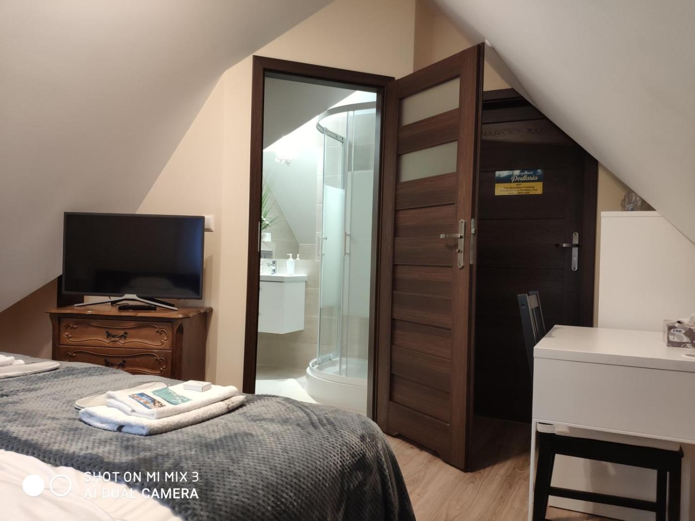 Pokój dwuosobowy z prywatną łazienką. Providing free toiletries, this double room includes a private bathroom with a shower, a hairdryer and slippers. The double room provides a wardrobe, parquet floors, heating, a flat-screen TV with streaming services, as well as garden views. Pokój Dwuosobowy - 2 osobowy. Powierzchnia pokoju ok.: 11 mkw. ;